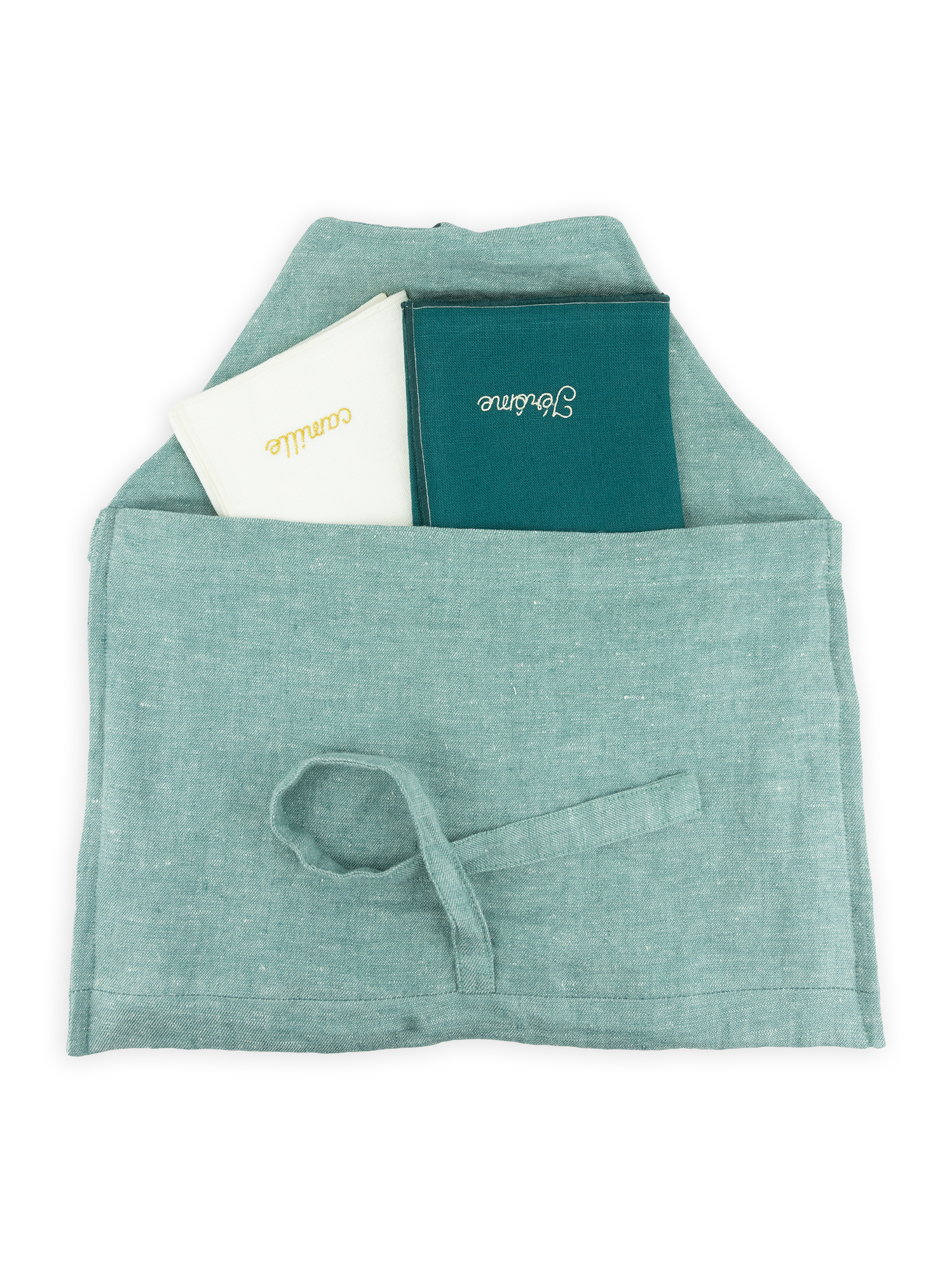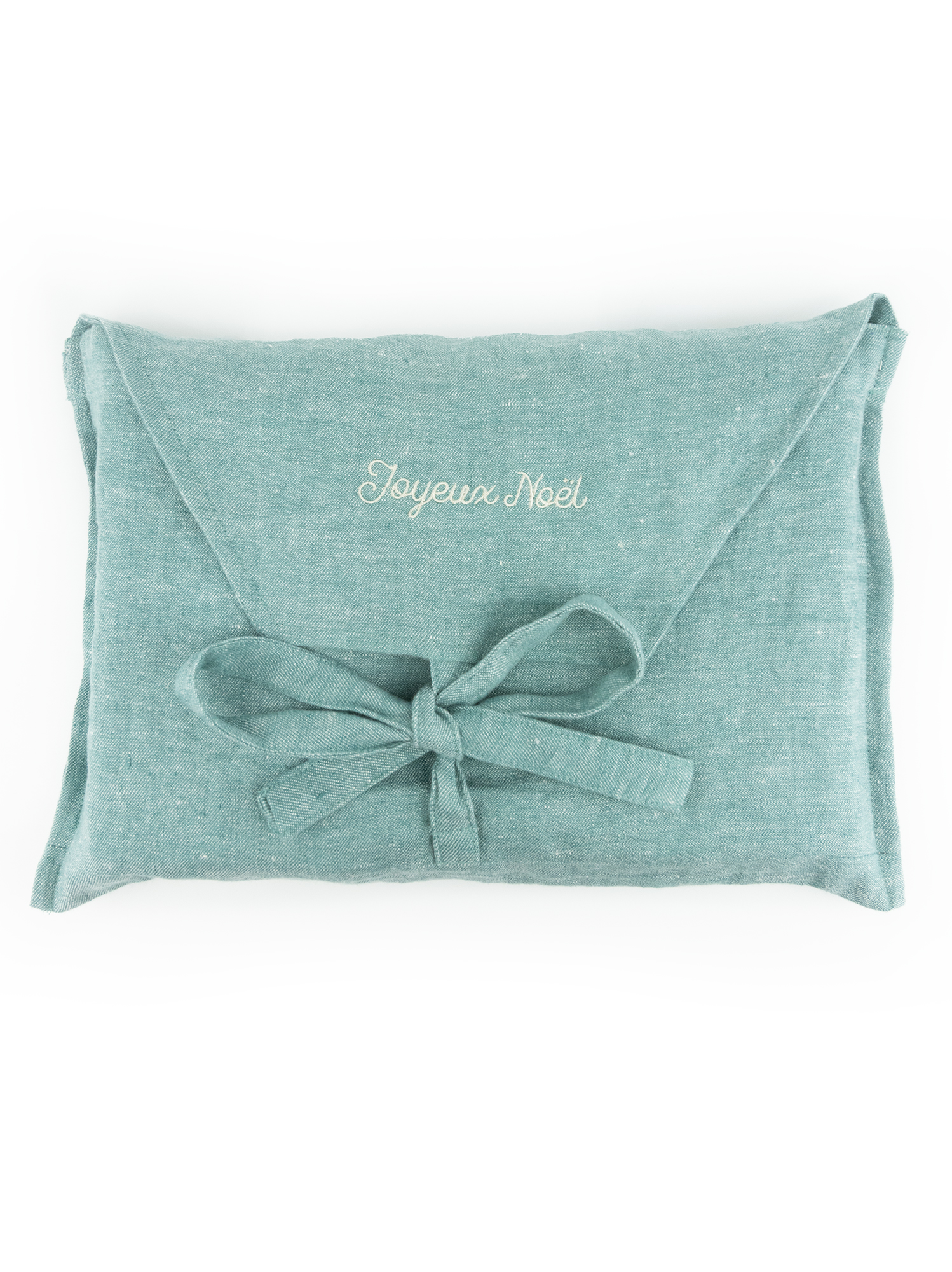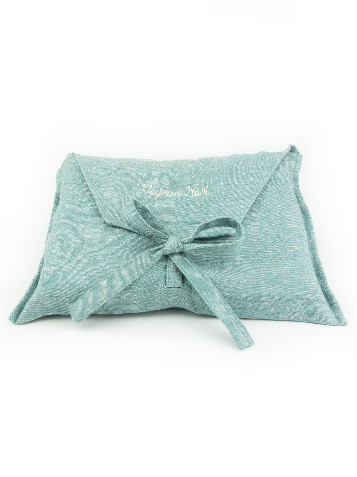 Enveloppe en lin lavé céladon chiné. Broderie écrue. Pour ranger des affaires ou vos serviettes de table. Doublée, souple et très pratique. Parfaite pour emballer un joli cadeau. A personnaliser avec un prénom, des initiales, le nom d’une maison ou un mot doux. Fabriquée en France, dans notre propre atelier en Lozère. Lin lavé certifié OEKO-TEX. Largeur 38 cm, hauteur 26 cm