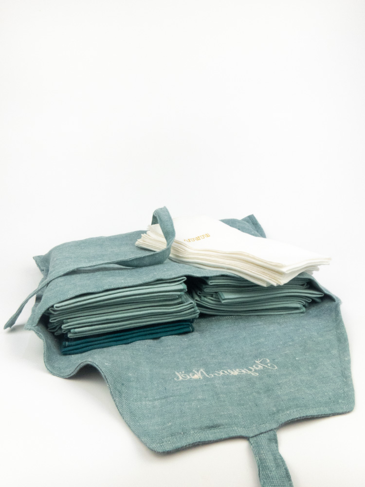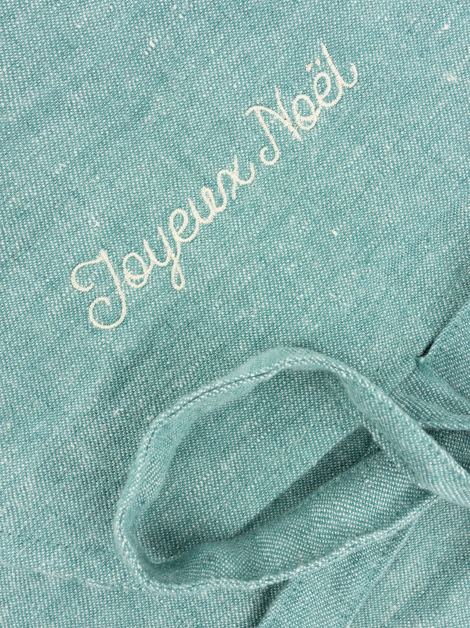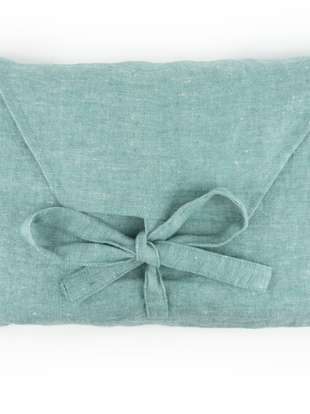 Enveloppe en lin lavé céladon chiné. Broderie écrue. Pour ranger des affaires ou vos serviettes de table. Doublée, souple et très pratique. Parfaite pour emballer un joli cadeau. A personnaliser avec un prénom, des initiales, le nom d’une maison ou un mot doux. Fabriquée en France, dans notre propre atelier en Lozère. Lin lavé certifié OEKO-TEX. Largeur 38 cm, hauteur 26 cm