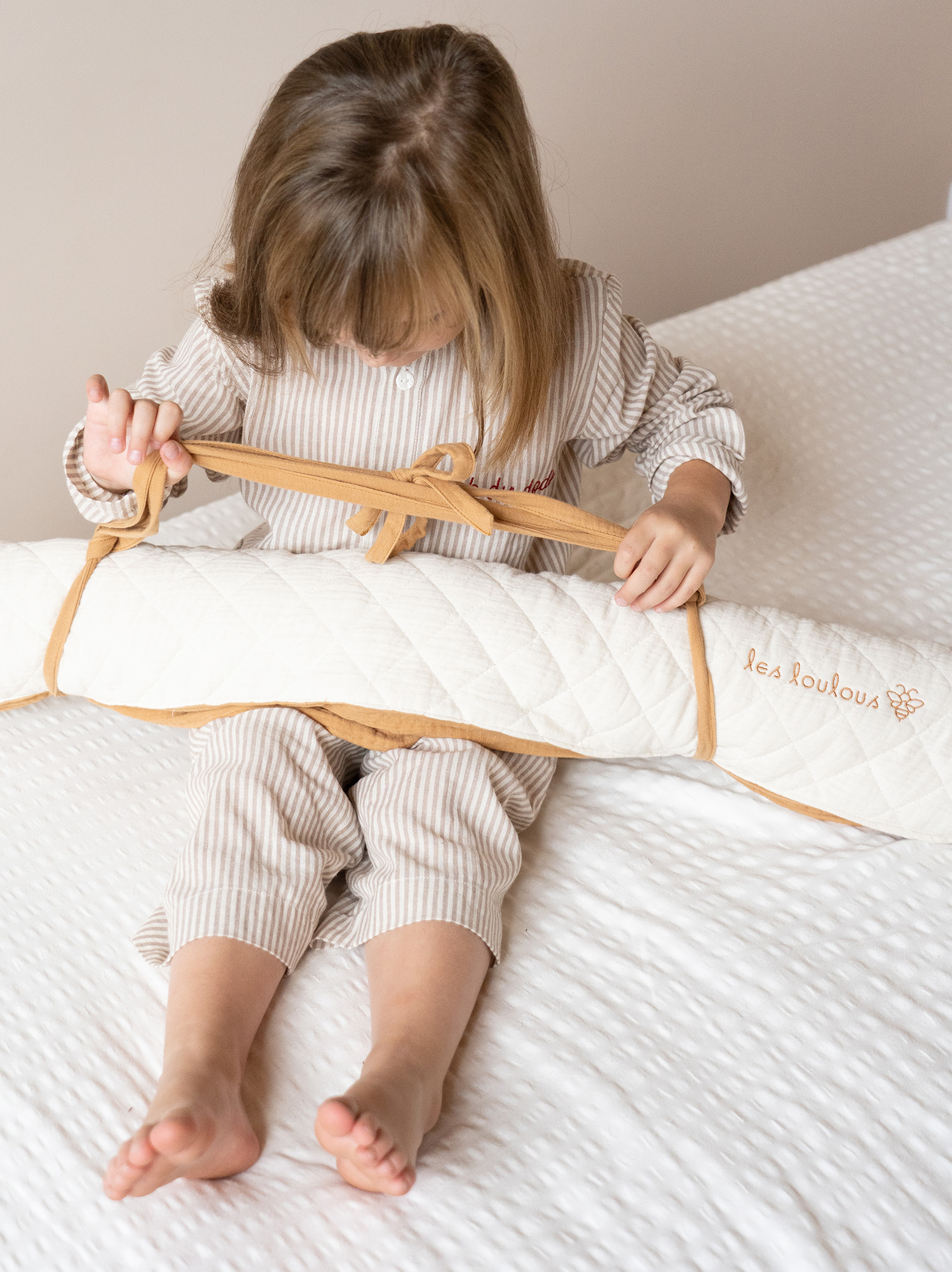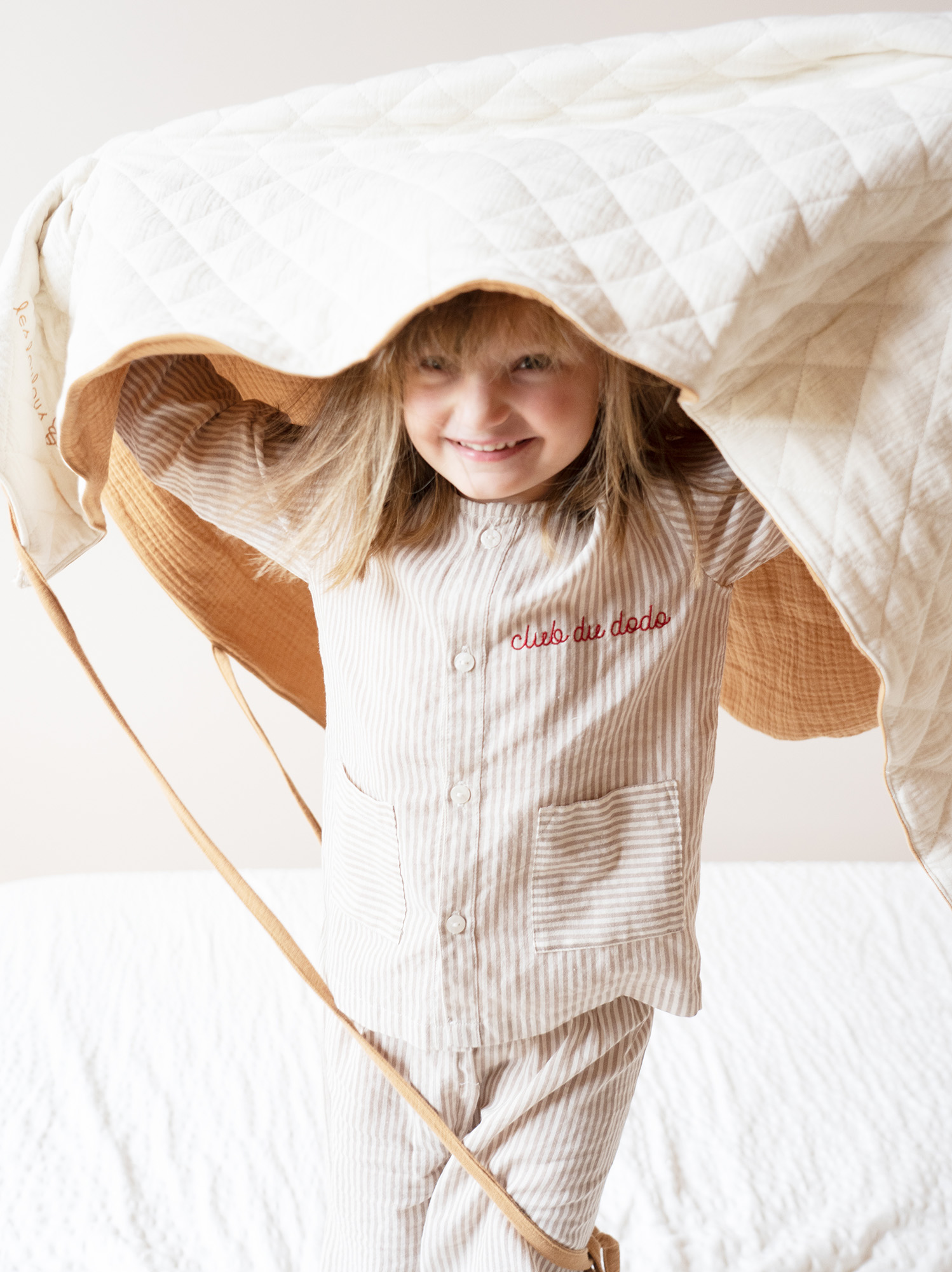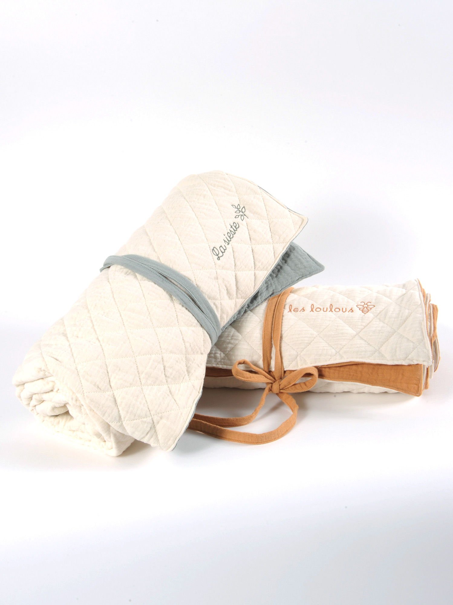 100% coton : matelassé écru et double gaze sauge. Moelleux et confortable.
