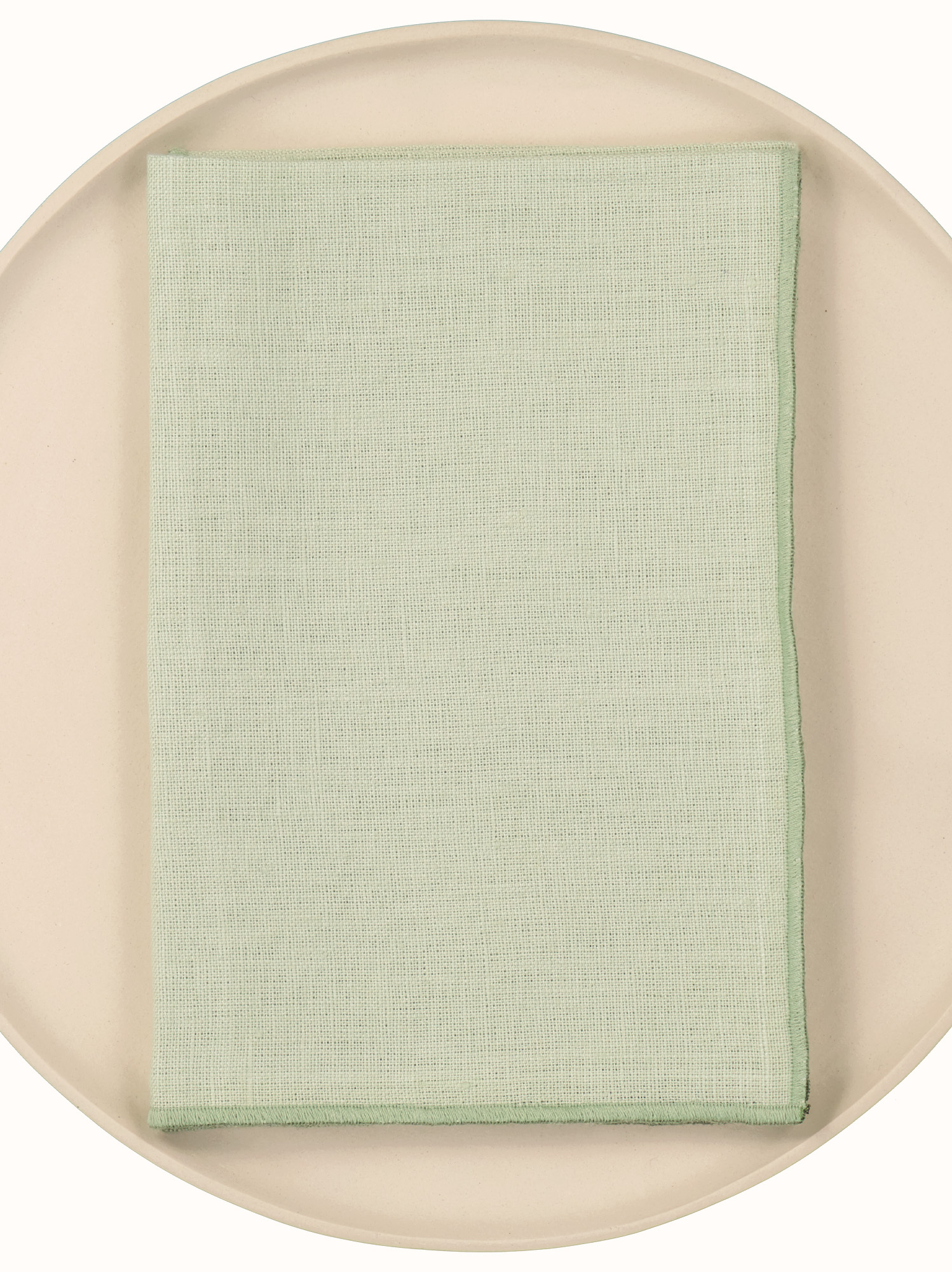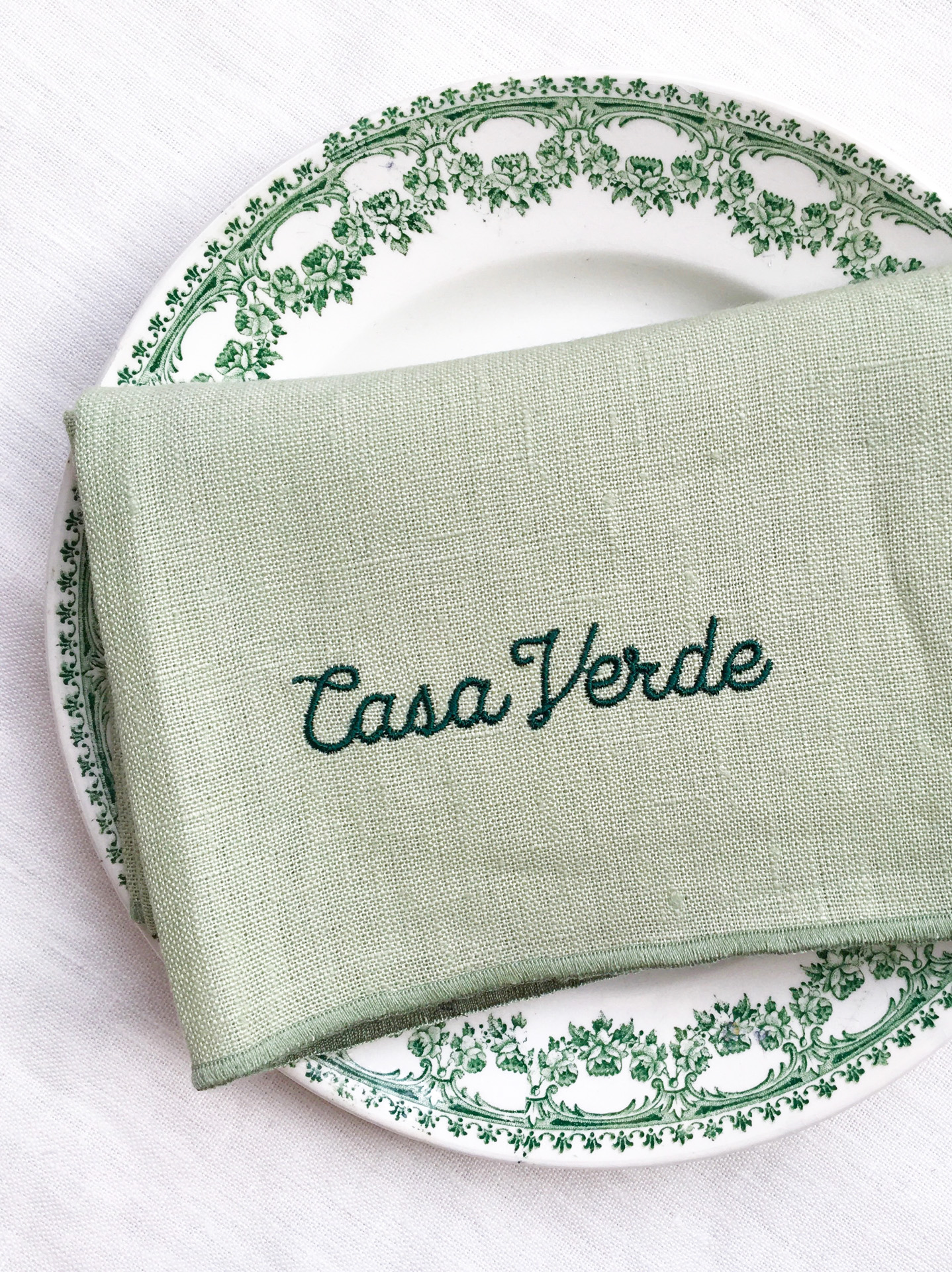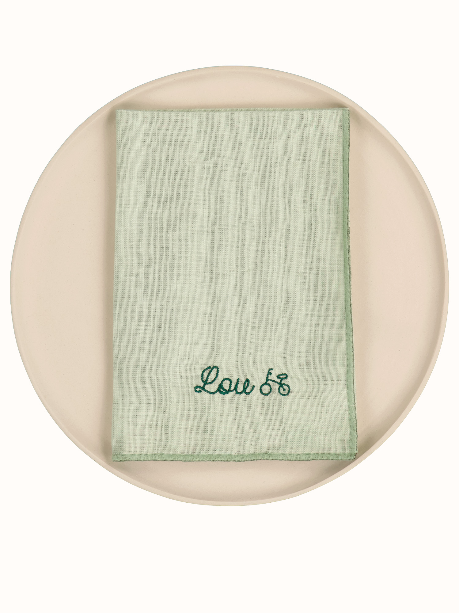 Personalized Light Green napkin in washed linen. Dark Green embroidery. Made and embroidered in France in our workshop.