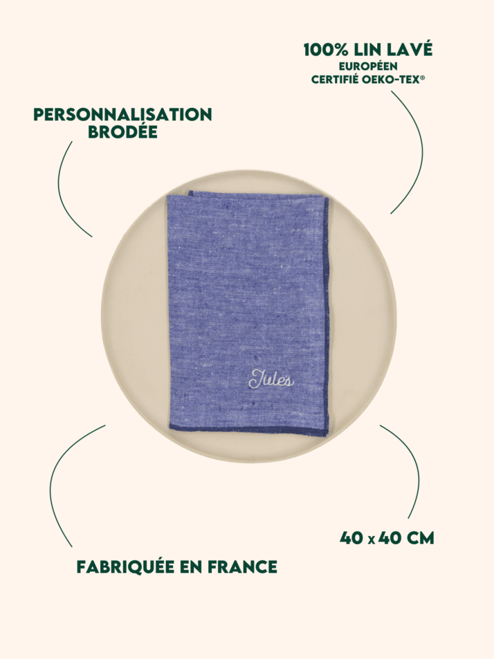 Tovagliolo Blu Denim in lino lavato screziato, finitura Blu e ricamo Bianco. Realizzato e ricamato in Francia nella nostra fabbrica.Il colore perfetto da abbinare ai tovaglioli Blu Bianco, Bianco Blu, Celadon Screziato.