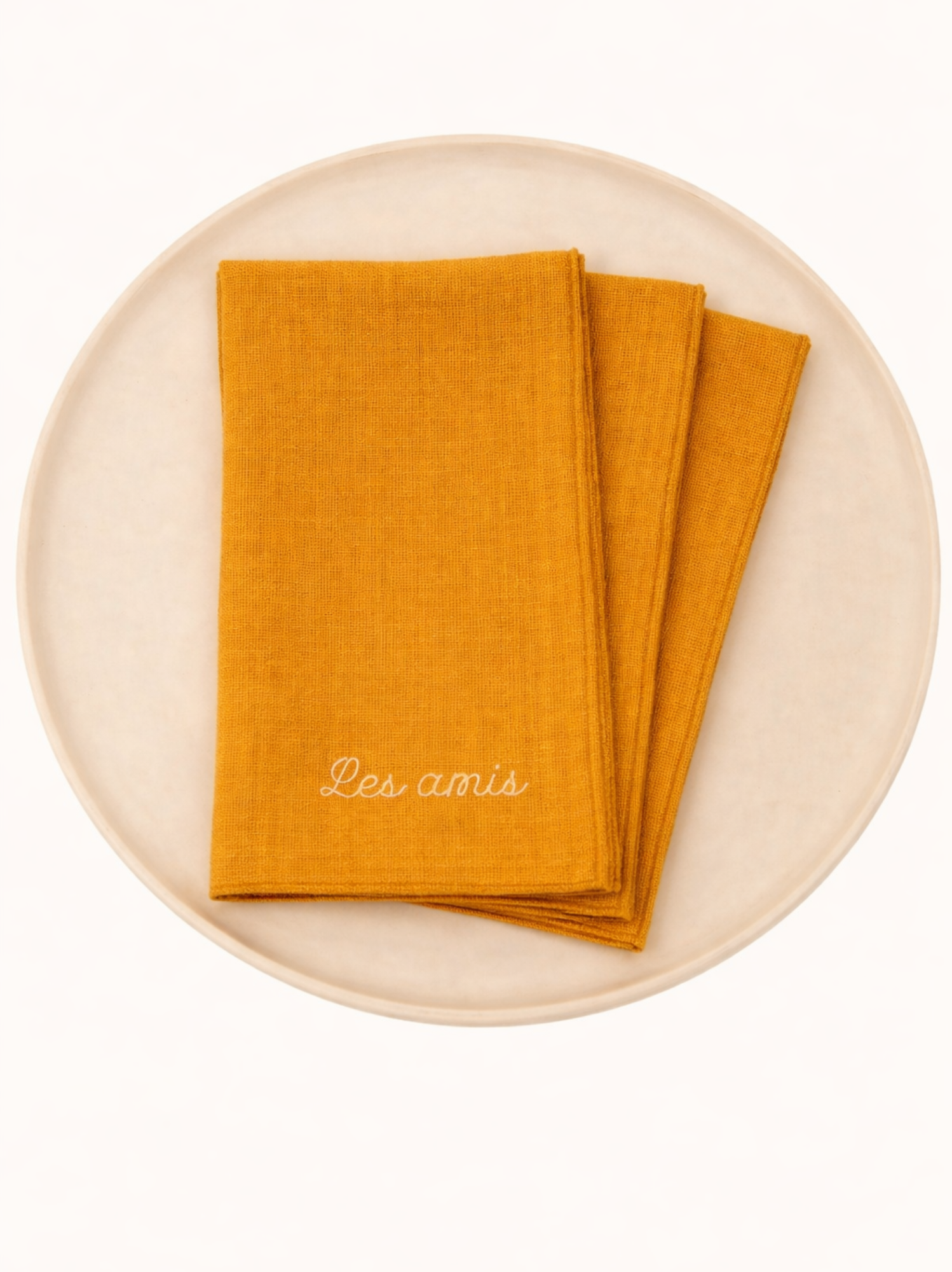 Set di 3 tovaglioli da tavola personalizzabili in lino lavato color miele. Realizzato e ricamato in Francia nel nostro laboratorio di Lozère.