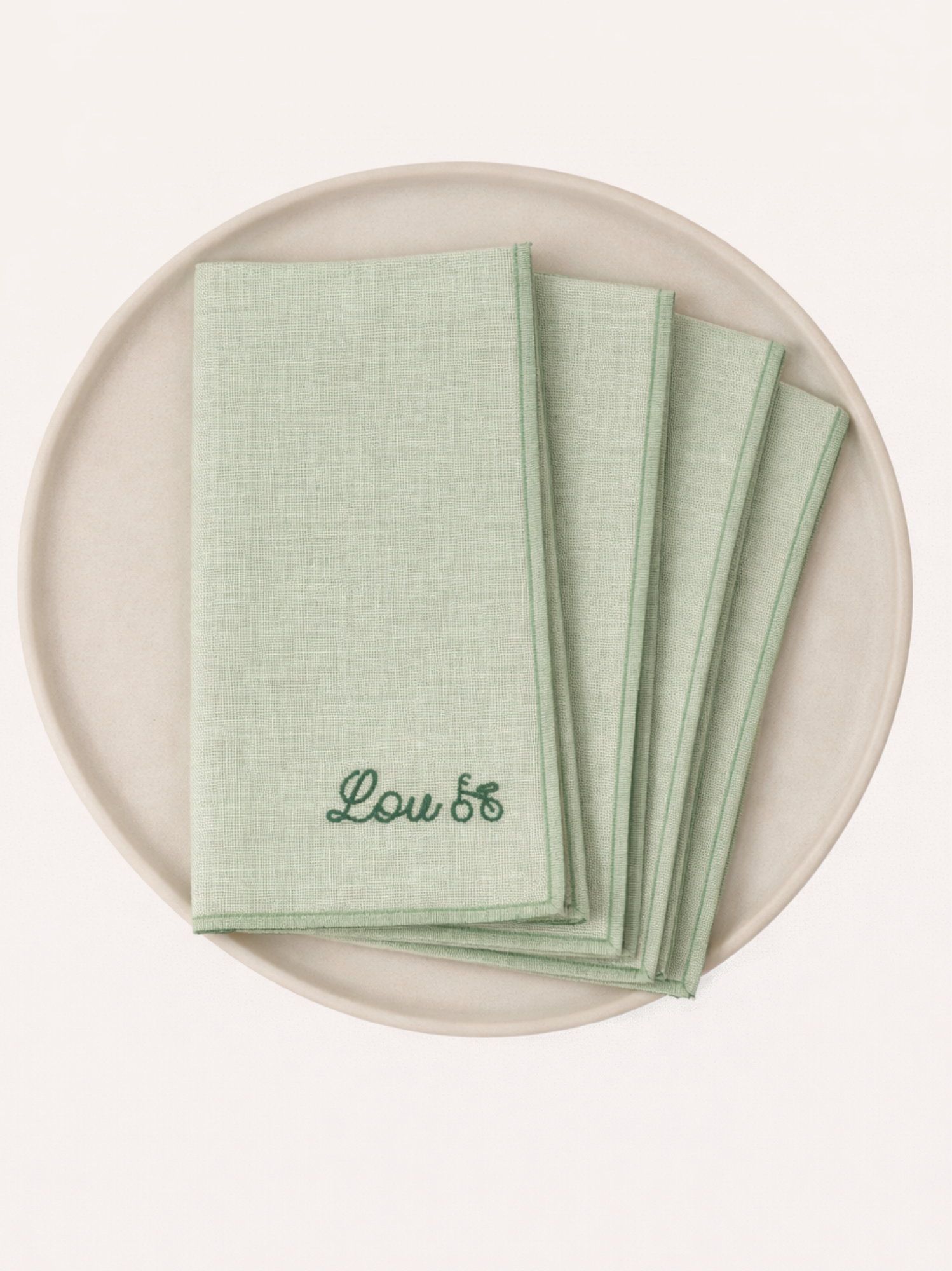 Set di 4 tovaglioli da tavola personalizzabili in lino lavato color Tiglio. Realizzato e ricamato in Francia nel nostro laboratorio di Lozère. 100% lino lavato.