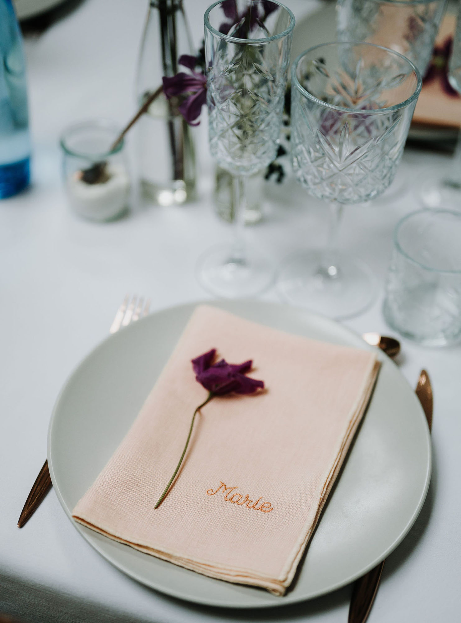 Choisissez nos serviettes de table en lin personnalisées avec le prénom de chacun de vos invités pour votre table de mariage. Une attention brodée pour chacun, pour un moment inoubliable.