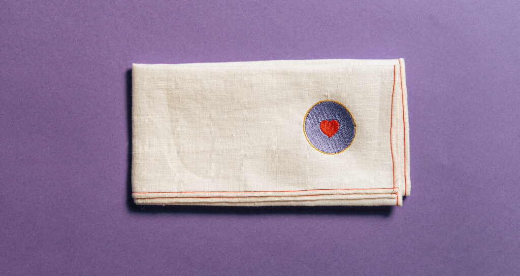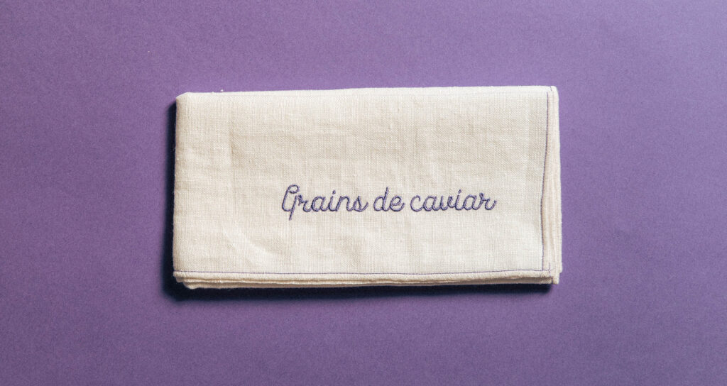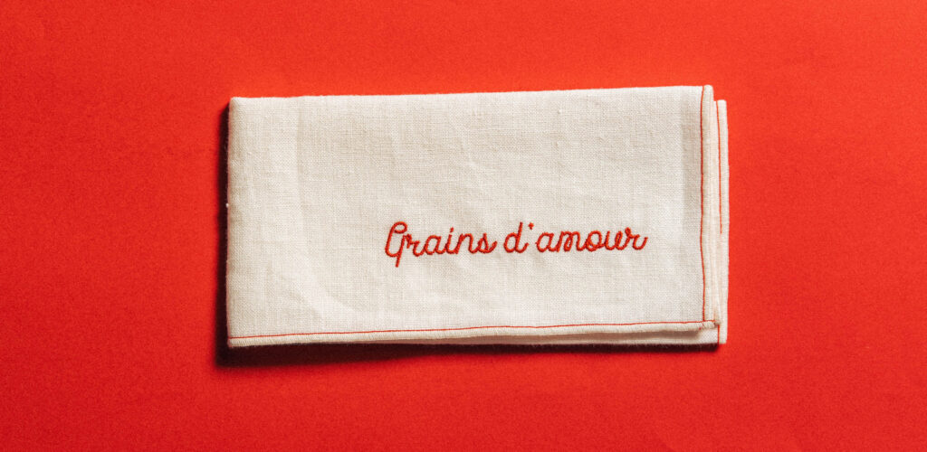 nähen s’invite sur la table spéciale Saint Valentin de Kaviari, avec des serviettes brodées pour l’occasion.