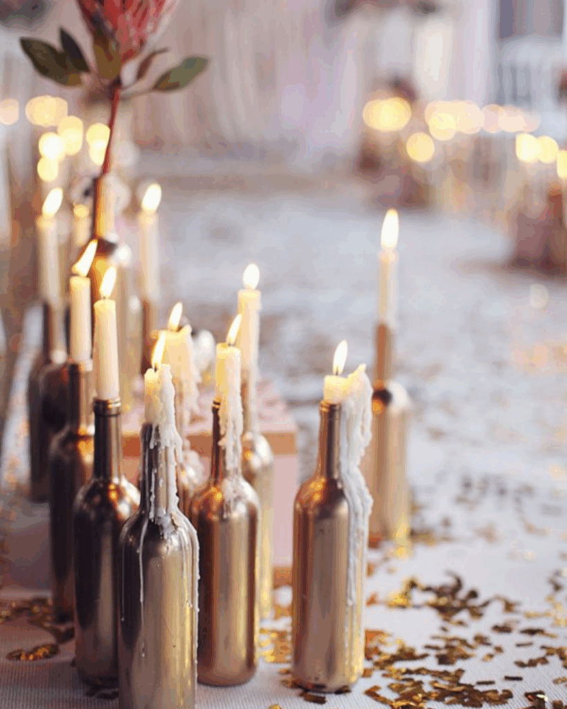 1. Des bouteilles en verre customisées, que vous pouvez peindre avec une bombe de peinture métallisée, recyclées en bougeoirs.