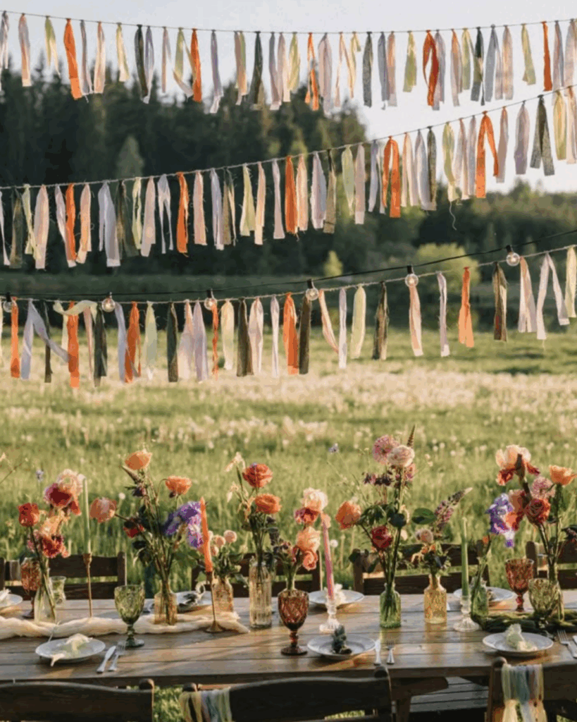 2. Des guirlandes de petits morceaux de rubans ou petites lamelles de tissus, à attacher vous-même au-dessus de la table ou sur les chaises.