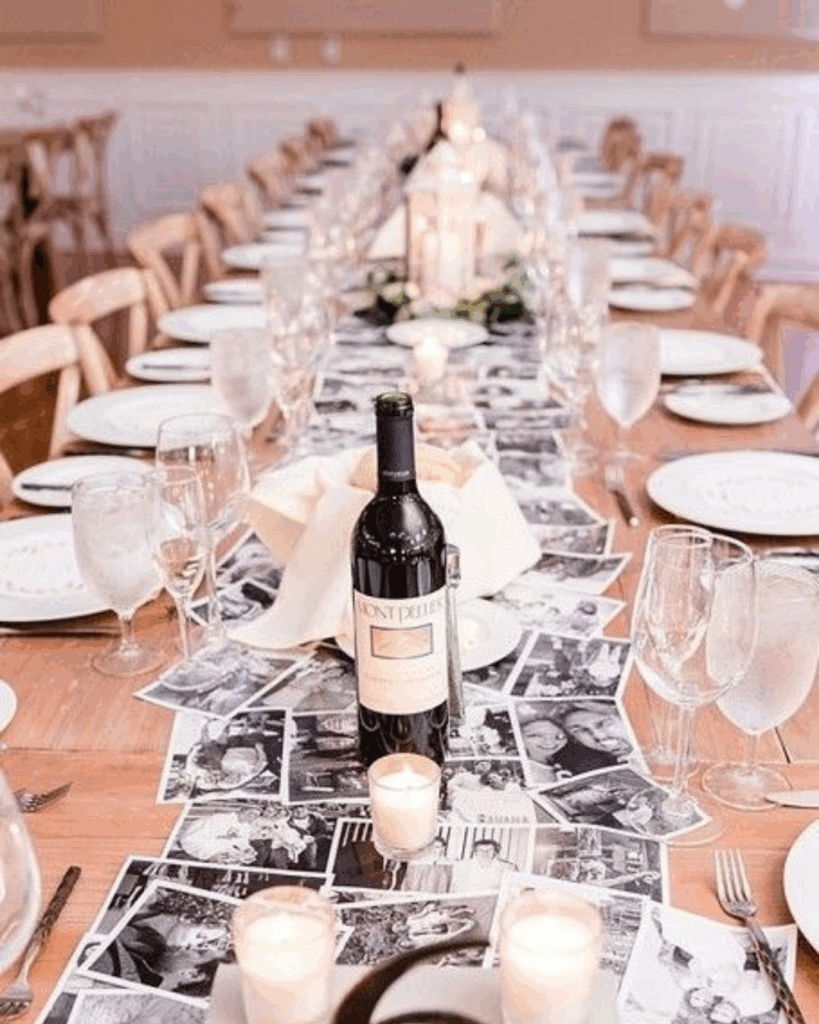3. Un chemin de table avec plein de photos souvenirs (ou photos dossier 🫣), imprimées en format polaroïd. À disperser au milieu de la table.